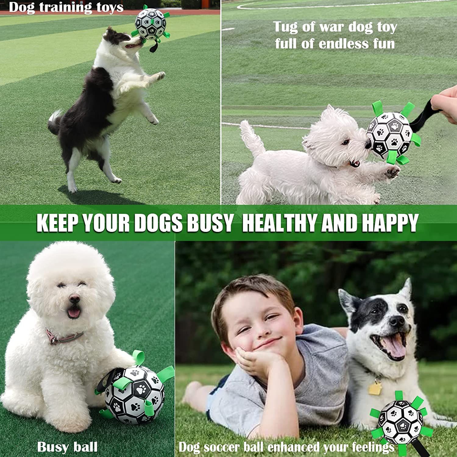 Interactive dog toys: Dog soccer ball can not only help your dog fight anxiety,depression and boredom,reduce mischievous behaviour and provides long-lasting entertainment,but also enhance good relationship between you and your pet by interactive outside game. Dog balls are not only a jolly dog toy, but also cute cat toys.Durable Puppy Toys Soccer Ball with grab tabs: Dog football is made of high quality PU,pure cotton yarn rubber lining and nylon materials, anti-bite, very strong and durable for not a chewer. The nylon tabs design make it easier for the dogs to fetch, toss, tug and retrieve. It is best dog toys to keep them busy,suitable for indoor and outdoor use.There's a longer handle for people to hold onto the ball to train your dogs.Floating Ball Toy for Dogs: Puppy toys interactive football is waterproof,no water absorption,no seepage, no deformation,lightweight,easy to float in water, so whether it is on the lawn, beach, swimming pool, lake, inside or outside, you can enjoy happy time with your pet dogs. It is a great dog water toy.Pump and Needle Adapter Included: There's a needle point adapter and a pump inside.The balls for dogs comes deflated. so you'll have to pump it up with the supplied pump and pin. Simply remove the needle from the pump handle, screw it into the pump, and pump up the ball until dog ball is full. The dog fetch ball provides hours of fun both indoors or out.Pls kindly note: The dog toy ball is only dog toys interactive ,it is not meant for a dog to bite unless only directly on the tabs, so the soccer ball for dogs is not suitable for aggressive chewers. Dog soccer ball with grab tabs is 6 inches in diameter, perfect for small & medium pets about 20-60 lbl. The package include 1xball, 1xpump, 2xneedles, 1x instruction manual .