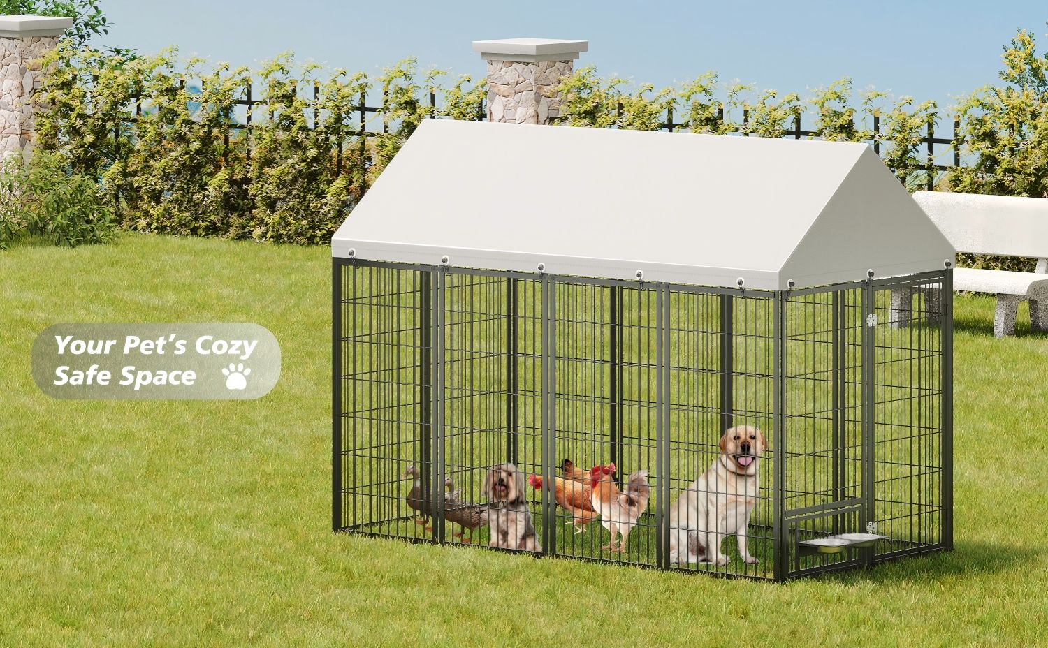 Reinforced structure: This outdoor dog cage is made of high-quality metal iron, with multiple load-bearing columns added for greater stability. The double door lock design prevents your pet from rushing out of the cage.