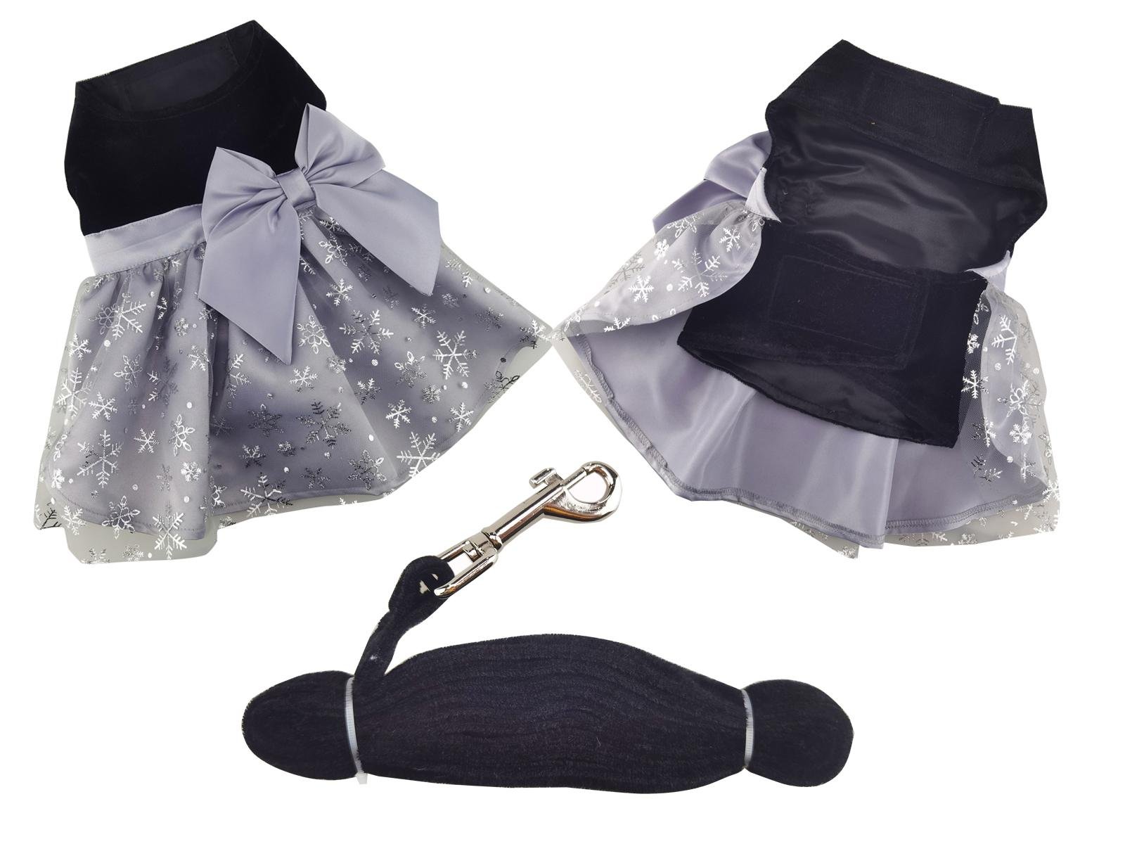 Holiday Dog Harness Dress - Black Velvet with Gray Snowflake Skirt Holiday Dog Harness Dress - Black Velvet with Gray Snowflake Skirt