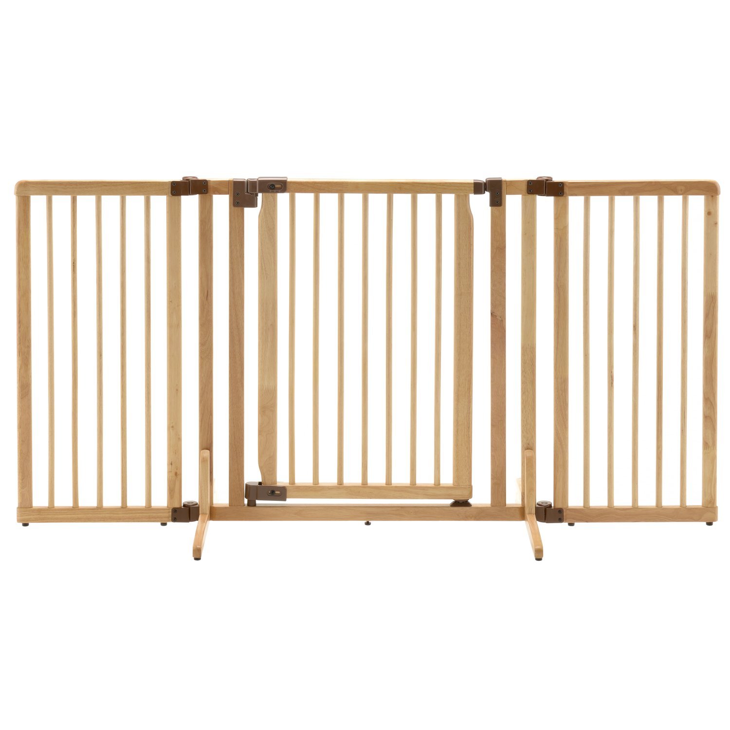 Expertly crafted with a beautiful natural wood design, the Wooden Premium Plus Freestanding Pet Gate is entirely made of wood and fits doorway and hallway openings from 33.5” to 63” wide! Plus, the specially designed walk-thru door opens in both directions and includes an upper/lower locking system to allow free movement and extra security! But the best bonus yet is the specially designed side panels adjust in increments of 10 degrees to allow you more options for use in your home! Simply adjust the gate to fit your personal needs.