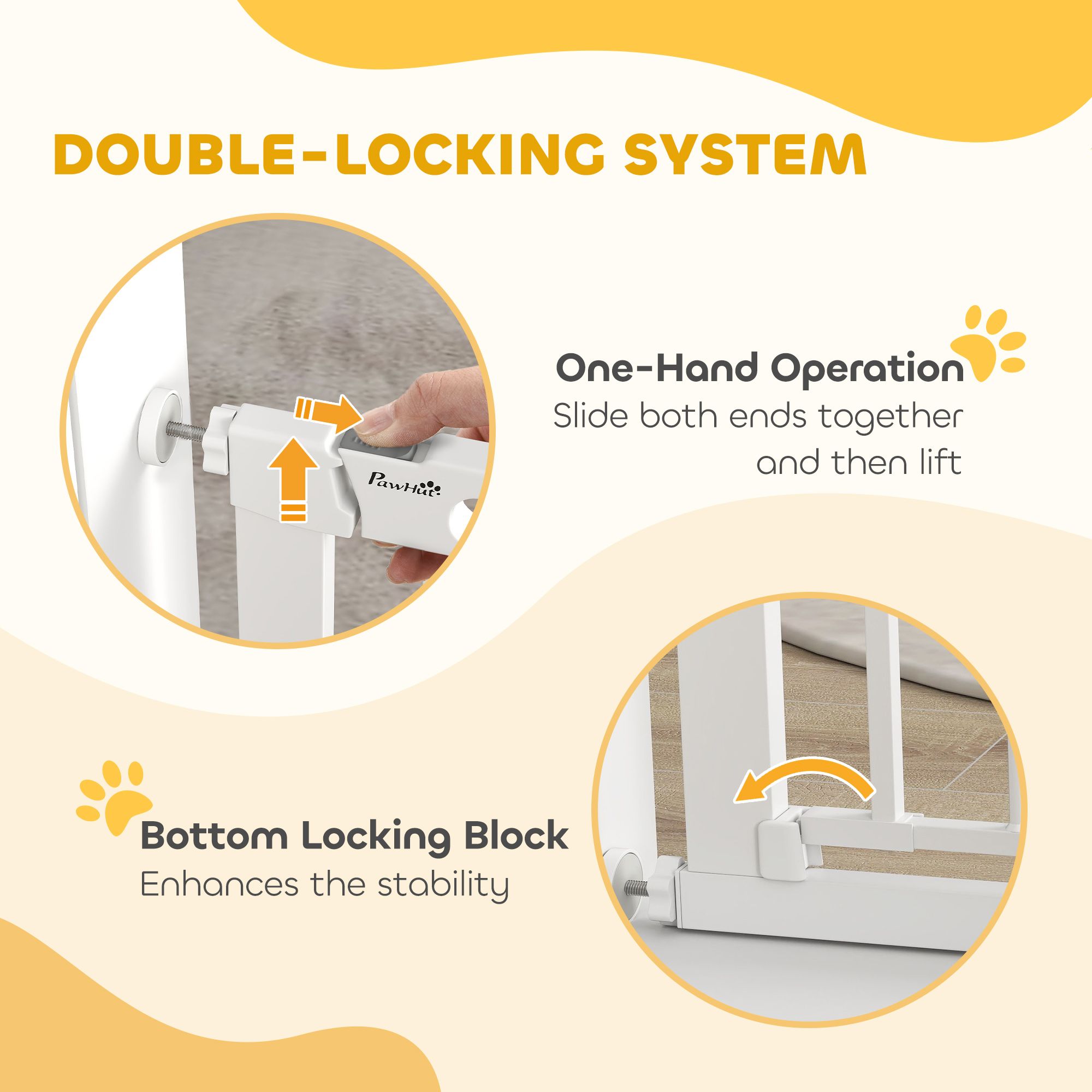 Keep pets away from rooms when required with the Pawhut dog gates with walk through door. Made from metal with lead-free treated surface for strength and safety. Ranges from 29.5" to 32.3"(75 - 82 cm) wide, allowing it to fit into different sized spaces with ease. Slide and lift, the handle is easy to open, allowing you to pass through quickly without your pet escaping for security. Double locking mechanism ensures your pet secured in a place to provide maximum safety.