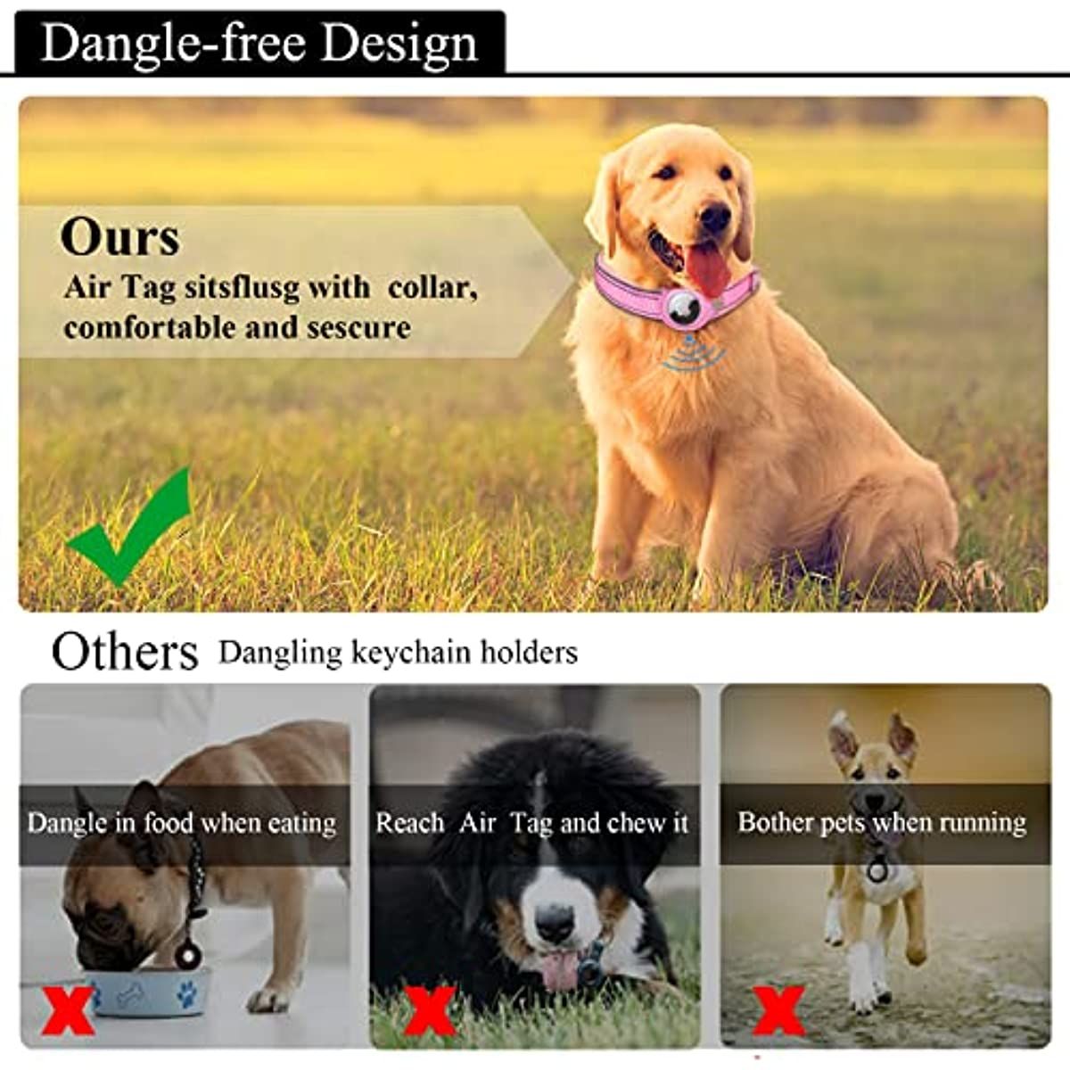 INTEGRATED DESIGN FOR AIRTAG: Are you always wondering where is your dogs or cats? Or are you always trying to find him/her? We're proud to announce our latest AirTag Dog Collar; integrated the AirTag Holder with premium basic Dog Collar. With our AirTag Dog Collar; allows you to keep tracking your beloved ones! (Note: The AirTag is not included) FIRM & COST EFFECTIVE: Bolting with the screw; the built-in leather pocket as Dog AirTag Holder is a perfectly fit and prevents your AirTag to lose or drop from it. 100% firmly combined with the Dog Collar; ensures your Apple AirTag stay connected with your dogs/cats. Plus; you won't need to purchase other detached; easily lost AirTag products. PREMIUM MATERIAL: Designed with premium material; reflective stripe; waterproof webbing and strict stitching ; our Air Tag Dog Collar is also featured with soft neoprene padding; prevent your dog's from any irritation or discomfort. No sharp edges or unfold sewing join; and sturdy premium plastic buckle and alloy D-ring ensures your dog's safety. PRODUCT FUNTIONS ENGINNERING: Our Air Tag Dog Collar is more convenient to release with the one-hand quick release buckle; and the D-ring provides a secure attachment for your dog leash and hanging accessories. The strong reflective stitching and edges make your dog's easier to be seen in darkness; safer for walking; running or jogging in the wild. MULTIPLE SIZE OPTIONS: The whole package includes: Airtag Dog Collar x1; Screwdriver x1. Our heavy duty Dog Collar comes with 4 colors and 4 sizes; perfect for small; medium and large dogs. Please measure your dog's neck before your purchase. S: 12"-14"; M: 15"-18"; L: 17"-20"; XL: 19"-22". (Neck Circumference in INCHES)