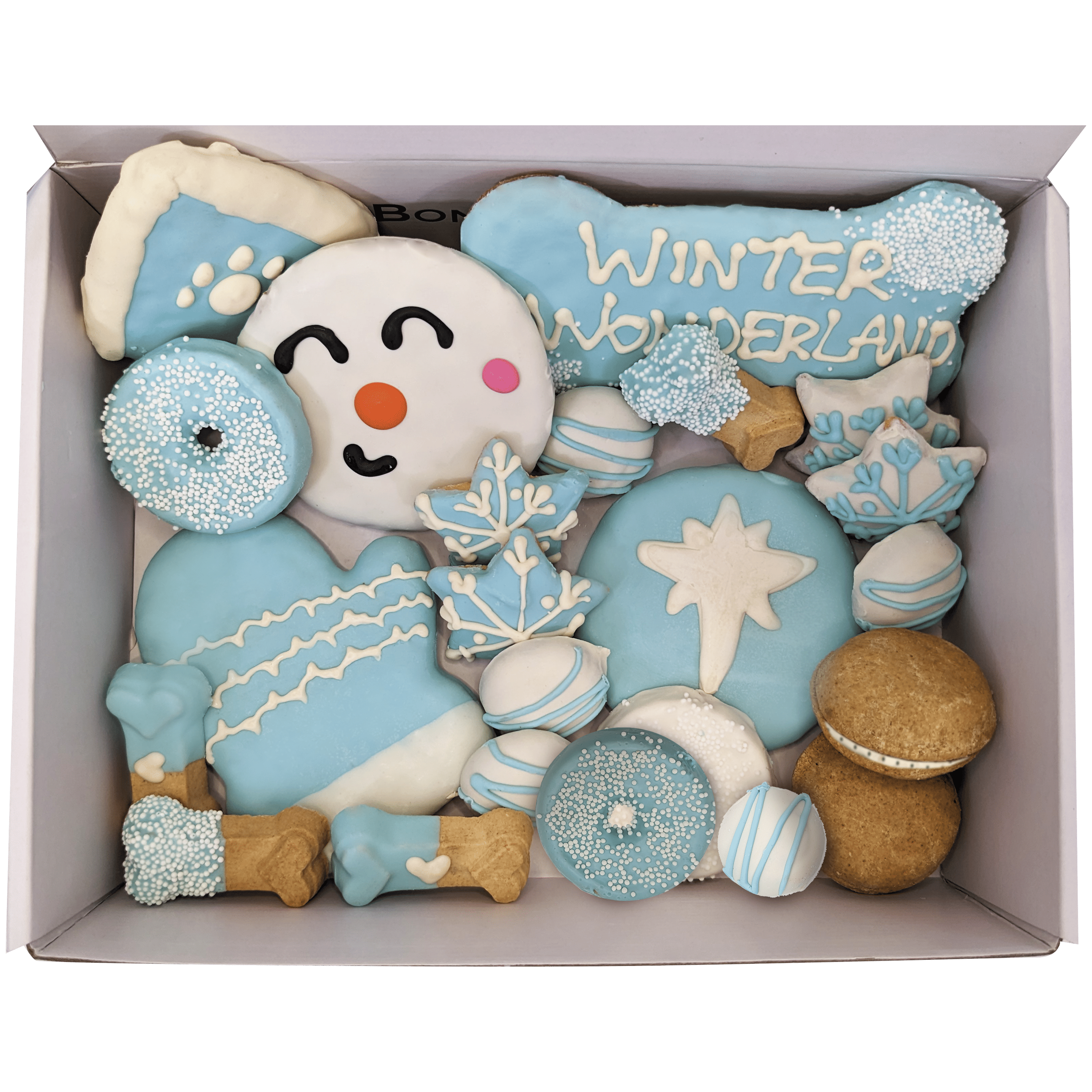 Includes 21 themed treats including snowman & snowflakes treats, winter biscuits, and dog macarons